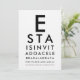Invite a sus invitados de la manera más llamativa con esta Invitación de Fiesta de Tabla de Ojos Personalizada, inspirada en la icónica prueba de lectura de oftalmología. El diseño comienza con la clásica y audaz "E" y continúa con líneas progresivamente más pequeñas, al igual que una tabla de Snellen real, transformadas creativamente en los detalles de su evento. Personalice cada línea con el nombre, fecha, ubicación y mensaje de celebración para un anuncio inteligente, profesional y verdaderamente memorable.