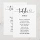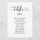 Ayude a los invitados a encontrar sus asientos con esta tarjeta de gráfico de asientos con letra de corazón moderno. Cada tarjeta presenta la caligrafía "Table" con un acento de corazón, un nombre de mesa escrito y una lista de invitados organizada debajo. Muestre las tarjetas juntas en una cuerda, tablero o marco para una recepción encantadora. Totalmente personalizable con los nombres de los invitados y asignaciones de mesa.
