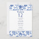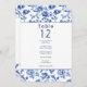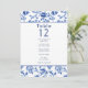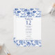 Este elegante diseño de asientos presenta la misma paleta de color azul y crema intemporal con un marco floral vintage, creando un aspecto cohesivo que complementa el tema boda. Cada número de tabla se muestra de forma destacada con una lista de nombres debajo de la cual se pueden organizar fácilmente los asientos. El intrincado borde floral y la refinada tipografía le aseguran que este asiento no sólo es funcional, sino que además es un complemento sofisticado de la decoración de la recepción. Perfecto para bodas formales, este diseño combina tradición y elegancia, guiando a sus huéspedes a sus asientos con estilo.