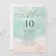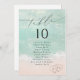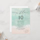 Hermosa acuarela turquesa y abstracta que resalta la ola del océano y los corazones en el fondo de la playa de arena, coronados por un guión elegante y un elegante estilo serif, moderno y sencillo. Grandes cartas de cartas de boda para bodas náuticas en la playa, bodas con destino tropical, boda con temática oceánica costera en verano.