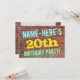 Este divertido diseño de invitación para una fiesta de cumpleaños presenta un mensaje como "¡LA FIESTA DE CUMPLEAÑOS DE [NOMBRE]!", donde el nombre se puede personalizar, en la parte delantera. El fondo presenta una representación de un muro de ladrillos que consiste en algunos ladrillos de color marrón rojizo. El texto del mensaje personalizable en la parte delantera presenta colores como azul, amarillo y verde, y tiene una apariencia inspirada en la de grafitis pintados. La parte trasera presenta un mensaje personalizable que podría incluir detalles relevantes sobre la fiesta de cumpleaños. Las invitaciones para fiestas de cumpleaños como esta podrían ser una forma divertida de invitar a familiares y amigos a una fiesta de cumpleaños que se celebra para alguien que está cumpliendo veinte años.