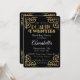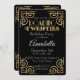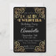 Esta invitación a la fiesta personalizado incluye un tema de los años 20 del Gran Gatsby. La frase "Roaring Twenties" está impresa en un tipo de letra estilo Broadway vintage de los años 1920 con un diseño de Relieve metalizado en oro falso. El marco de la invitación combina con las esquinas decorativas de estilo Art Déco dorado. El fondo es un negro sólido. Puede personalizar la invitación para incluir su propio nombre, información del fiesta u otro texto del personalizado.