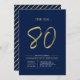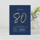 Celebra tu día especial con esta sencilla y elegante invitación a la fiesta de cumpleaños número 80. Este diseño presenta un guión de broche "The Big 80" con un diseño limpio en una combinación de colores azul marino y oro. Hay más diseños y suministros de fiesta disponibles en mi tienda BaraBomDesign.