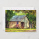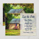 Este anuncio de boda Save the Date presenta un granero rústico con una bandera estadounidense patriótica en un encantador entorno campestre arbolado.