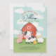 Celebra el segundo cumpleaños de tu pequeña con esta encantadora invitación al corral de animales de granja con un granero al estilo Watercolor rojo, lechón, vaca, oveja y polluelo. Divertido y colorido, con "Oink, Baa, Moo - ¡el nombre se está volviendo dos!" en la parte delantera y el clásico gingham rojo en la parte trasera. ¡Ideal para una fiesta de cumpleaños en la granja de niños!