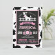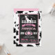 Invitación de cumpleaños con tema de granja con vaca, impresión piel de vaca, marca de gingham rosa marca de diseño de chica de campo sobre fondo de pizarra.