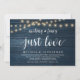 Bello Nothing Fancy, Just Love, Boda Elopement Invitación / tarjeta de invitación de fiesta, en diseño rústico moderno, Farm String Lights, madera de cabaña Navy Blue temática. Esto es perfecto para tu recepción de bodas y fiesta de celebración post-boda. Diseñado por TeeshaDerrick