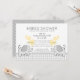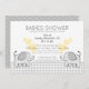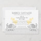 Dulces mellizos elefantes invitan a una ducha de bebé con un patrón de chequeo de gingham gris y corazones amarillos, puntos de polka gris en el reverso de la tarjeta.