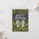 Tarjeta de cumpleaños personalizado con "Feliz cumpleaños" en tipografía mixta, arco de plata, cinta satinada y fondo de camuflaje verde.
