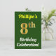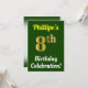 Este diseño de invitación para fiestas de cumpleaños muestra un mensaje como "¡La celebración de cumpleaños número 8 de Phillipe!", donde el nombre puede ser personalizado, y donde el número "8" tiene una apariencia falsa de oro. También cuenta con un fondo de color verde. Los detalles del evento en la parte posterior se pueden personalizar. Se podría usar para invitar a la gente a la celebración de octavo cumpleaños o fiesta de cumpleaños de alguien. [~Z0000121]