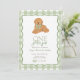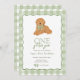 Celebrate your little one’s “one golden year” with this sweet puppy themed invitation! Featuring a playful golden doodle wearing a green gingham bow and a matching green gingham border, this design is perfect for a first birthday party. Easily customize the name, date, and party details right in your browser—no special software needed. A charming choice for dog lovers and darling birthday celebrations alike!