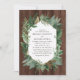 Esta rústica invitación a la boda incluye una florida corona de hojas verdes con un cálido fondo de madera. El elegante estilo serif del marco central de color blanco roto aporta un toque de sofisticación, por lo que este diseño es perfecto para un boda inspirado en la naturaleza. Los tonos tierra y los elementos orgánicos crean un ambiente sereno y acogedor, ideal para las parejas que aman la belleza del exterior.
