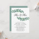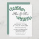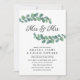 Invitación a una boda lesbiana con la Sra. y la Sra. escrita en un hermoso guión con una ampersa de bonito y enmarcada por ramas verdes curvadas alrededor del texto en tonos apagados de verde fresco.