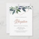 Esta invitación de recepción de boda elegante y de moda presenta una forma geométrica de oro rosa falso rodeada de hermosas ramas de vegetación, con tipografía de guión de oro rosa falso con estilo.