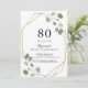 Esta invitación geométrica a la fiesta de cumpleaños 80 eucalipto es perfecta para una simple fiesta de cumpleaños. El diseño se compone de ramas de eucalipto botánico y verde a mano y hojas que adornan un marco geométrico dorado.