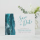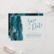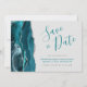 Esta elegante y moderna tarjeta de fecha guarda un verde azulado borde de batido azul color agua recortado con un falso purpurina plateado. El texto del personalizable combina el guión de escritura a mano azul verde azulado y cursiva con el tipo de letra de copperplate gris carbón en un fondo gris claro. El reverso presenta un diseño de ágata verde azulado y plateado a juego.
