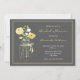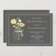 Ruidosas invitaciones a la ducha de novias con un frasco de albañil lleno de flores amarillas en un fondo gris.