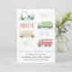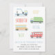 Invitación a la fiesta de cumpleaños de un niño con un camión de remolque, un camión de bomberos, un camión de basura y un autobús escolar.