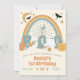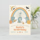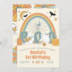Invitación de cumpleaños de Halloween con temática retro Groovy con un arcoiris, fantasmas espeluznantes, calabazas, hongos y flores. ¡Ideal para un fiesta con temática hippie de los años 70!