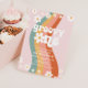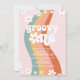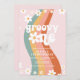 Groovy de inspiración retro Una invitación de primer cumpleaños con arcoiris de estilo hippie, daisies y fuentes boho y colores.