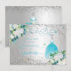 Tarjeta de guardar fecha de Quinceañera con vestido azul acua elegante de PixDezines, flores de acuarela en rosa azul polvoriento, hortensia y follaje verde exuberante,