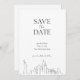 Moderno diseño minimalista para guardar la fecha con un dibujo lineal del paisaje urbano y fuentes elegantes sobre un fondo blanco, que contrasta maravillosamente con el negro oscuro.