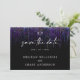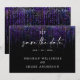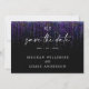 Guardar la fecha abstracto moderno - Un garland atrevido y con destellos morados cae en cascada por la página, en caligrafía manuscrita está "guardar la fecha" - las iniciales de la pareja en la parte superior - el resto del texto es simple y limpio - todo sobre un fondo negro. Papelería de boda elegante.