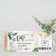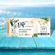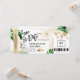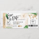 Destino Boda en la playa Pase de embarque Ticket dorado Avión Guardar la fecha con icono de barco de crucero con hojas tropicales