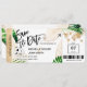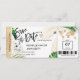 Destino Boda de playa Pase de embarque Ticket Dorado Avión Guardar la fecha con corazón e icono de avión con hojas tropicales