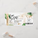 Destino Boda de playa Pase de embarque Ticket de avión dorado Guardar la fecha con icono de crucero con hojas tropicales
