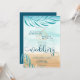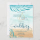 Un guion tropical de moda de destino de playa de verano boda tipografía con hoja de palmera editable, perfecto para una boda al aire libre con degradado de playa de color agua pintada a mano.