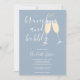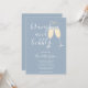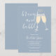 Una elegante invitación de brunch y burbujeante para la despedida de soltera con copas de champán y nombre de guión signature, esta invitación elegante se puede personalizar con su información en letra chic en un fondo azul polvoriento. Diseñado por Thisisnotme©