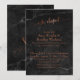 Esta moderna y elegante suite de invitaciones de boda y eventos combina algunas sencillas tendencias de diseño de bodas de una manera fresca. Sobre una textura de fondo de mármol negro, he utilizado una fuente de caligrafía moderna y bonita de mi colección para renderizar gráficos que representan las palabras "nos escapamos". Las palabras han sido decoradas con un efecto metálico de falso foil de cobre. El texto editable se representa en una fuente serif versátil utilizando un tono de cobre coordinado. La palabra "amor", adornada con cobre y utilizando la misma fuente de escritura, se agregó en diagonal en la parte posterior. //