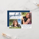Sofisticada plantilla de graduación horizontal de 2 fotos de estilo collage con acentos en una paleta clásica azul marino y blanco. El diseño incluye un guión con letras a mano de moda "graduado" y 2 fotos junto con el nombre del graduado, la escuela y el año de graduación. En la parte de atrás, hay franjas de felicitación y los detalles del evento. Clases obligadas de 2019