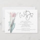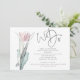 Guion minimalista Nosotros hacemos código QR de foto de boda. Agregar su código QR en el sitio web de su boda en la parte posterior hace que esta sea una opción conveniente para que sus invitados respondan y vean todos los detalles sin la necesidad de tarjetas de respuesta y detalles separados. Su código QR se generará automáticamente para actualizar el código de muestra en el diseño, cuando simplemente cambie la URL de muestra en la plantilla con la URL de su sitio web de boda. Nosotros hacemos está en un conjunto de guiones modernos y personaliza fácilmente el resto del texto. Un tulipán moderno de acuarela en rosa con follaje azul está a la izquierda.