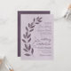 Esta invitación a la boda presenta un diseño moderno con un texto justificado y una pizca de hojas pintadas a mano en tonos de lila y ciruela. La letra incluye una fuente de escritura moderna y el fondo morado polvoriento de mármol agrega textura y profundidad. Sencilla, rústica, única y moda, esta invitación es una excelente manera de añadir estilo contemporáneo a la elegancia clásica.