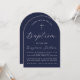 Una invitación simple, minimalista, al bautismo de niño. Sólo tiene texto blanco sobre fondo azul marino. En la parte superior hay una cruz blanca con texto en arco encima de ella. La ocasión y el nombre están escritos en guión.