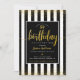 "Feliz cumpleaños". Envíe este impresionante, moderno, pequeño y brillante purpurina de confeti dorado y guión de tipografía contra un fondo de rayas blancas y negras, invitación personalizada para un evento que recordar. Personalice el texto del personalizado con el nombre del invitado de honor, el año de cumpleaños y la información del lugar de fiesta. Perfecto para los años 40, 50, 60, dulce 16 o cualquier otra edad hito. ¡Ideal para la modista que ama el purpurina moderno y el glam y garantiza que se divierte con estilo en su fiesta especial! En esta moderna y especial colección también se ofrecen platos, servilletas y otros productos de cumpleaños. Simplemente escriba el nombre del chica de cumpleaños, el año de cumpleaños y la información del lugar de fiesta y puede personalizar fácilmente esta invitación de cumpleaños. Por favor, envíame cualquier pregunta o petición.