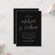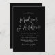 Las invitaciones minimalistas a la boda con sus nombres mostrados en un sencillo guión en blanco con los detalles de su boda mostrados abajo en un fondo negro. La invitación vuelve a un fondo negro sólido.