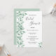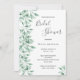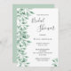 Una invitación a la moda Bridal Shower en blanco y verde. Un fondo blanco de moda en la parte delantera. Decorada con vegetación botánica, estribos y follaje. Guión moderno de gran tamaño con letras a mano, tipografía con el texto: Bridal Shower. Plantillas para el nombre de la novia y detalles del fiesta. Texto gris oscuro. Fondo: fondo verde claro.