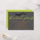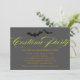 Este diseño presenta las palabras "fiesta de disfraces" en verde como un guión. Dos murciélagos negros se sientan justo encima de ellos y los detalles de su fiesta en naranja se sientan debajo. Fijado sobre un fondo gris oscuro. Gráficos ©Cheri Wenger.