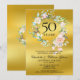 Con una delicada guirnalda de rosas florales en acuarela sobre un fondo de lámina de oro, esta elegante invitación botánica para el 50 aniversario de bodas se puede personalizar con la información de su aniversario especial. El reverso presenta una guirnalda floral a juego que enmarca las fechas de su aniversario en texto elegante sobre un fondo de lámina dorada. Diseñado por Thisisnotme©
