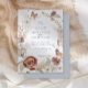 El diseño de la invitación de boda de flores silvestres BOHO fresco y de moda fue pintado a mano con acuarela por la artista y diseñadora con licencia internacional, Audrey Jeanne Roberts. Las flores silvestres secas y de colores cálidos y silenciados están dispuestas en una corona ovalada suelta con arte de línea y un par de delicadas mariposas, hierba de pampas y follaje de hoja de gingko. Esta versión tiene un frente blanco ligero y aireado con texto azul pizarra polvoriento y fondo en el reverso. Derechos de autor.