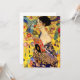 Tarjeta con la pintura al óleo de Gustav Klimt Lady with Fan (1918). Una mujer con un kimono azul sostiene un ventilador rojo contra un colorido fondo amarillo de flores y pavos reales. Un gran regalo para los amantes del arte japonés y europeo.