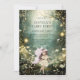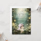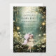 Una mágica invitación al primer cumpleaños con temática de hada para el fiesta de primer cumpleaños de una niña, con un entorno forestal encantado en el bosque con flores, luz brillante y un hada en un camino arbolado. Disponible en forma impresa, como descarga digital, o ambos.