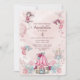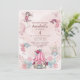 Esta caprichosa y encantadora invitación a la fiesta de cumpleaños incluye un tema de princesa de cuento de hadas en el jardín de hadas. El fondo está decorado en tonos suaves, de mármol, rosa y blanco, con varias imágenes colocadas alrededor del borde. Dos hermosas hadas están impresas en las esquinas superiores, salpicadas de polvo de purpurina de diamantes. Se imprimen dos mariposas debajo de las hadas a ambos lados. Una mariposa es de color rosa rosa bonito y la otra es azul irrisorio. En el fondo se imprimen dos hadas más, volando sobre una bonita casa de jardín. El hada de la derecha lleva una corona de princesa brillante. Los ramos florales de colores pastel acentúan las esquinas inferiores.