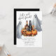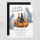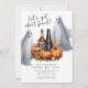 Esta invitación espeluznante y divertida incluye un fantasma, calabazas, un cóctel espeluznante y un cráneo. Las palabras "Seamos enfrentados a las hojas" están escritas en un tipo de letra de guión. Es la manera perfecta de invitar a tus amigos a una fiesta de Halloween donde pueden venir vestidos con sus disfraces y disfrutar de cócteles.