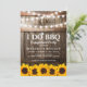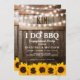Invitaciones rústicas a la fiesta de compromiso "I DO BBQ" que incluyen fondo de barril de madera de grano de campo, luces de cuerdas de centelleo, girasoles dorados amarillos, anillo de compromiso boda, tu monograma y una plantilla de celebración de ducha de parejas que es fácil de personalizar.