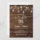 Esta elegante invitación se caracteriza por sus brillantes lámparas de cuerda y sus tarros de albañil con un fondo rústico de madera.