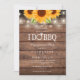 Luces de cadena bonitas y girasoles decoran los detalles de la celebración de su fiesta de compromiso especial en tipografía elegante sobre un fondo de madera rústica. La parte posterior presenta sus iniciales de monograma dentro de un girasol a juego. Diseñado por Thisisnotme©
